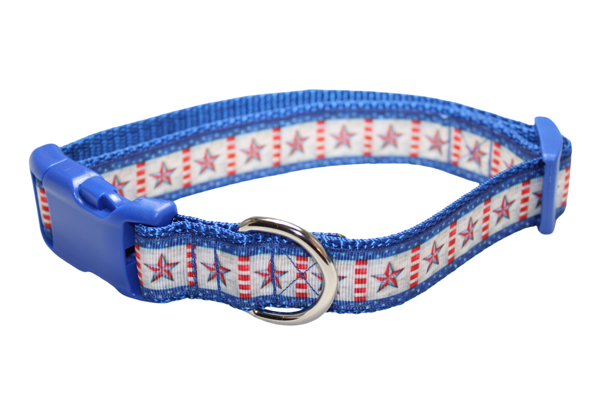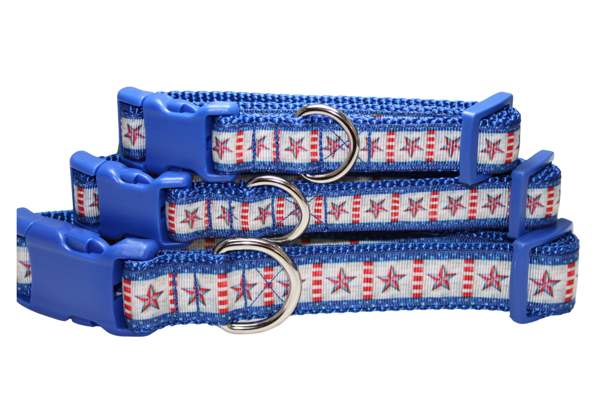 All collars are handmade made using 1-inch (x-large and large) 3/4 inch (medium and small) heavy nylon webbing grosgrain ribbon. The buckle is heavy grade plastic with side release. The x-large collar adjust to best fit dogs with necks ranging form 18-28 inches. The large collar adjusts to best fit dogs with necks ranging in size from 15 - 22 inches. The medium collar adjusts to best fit dogs with necks ranging in size from 12-18 inches. The small collar adjusts to best fit dogs with necks ranging in size from 9 to 14 inches.