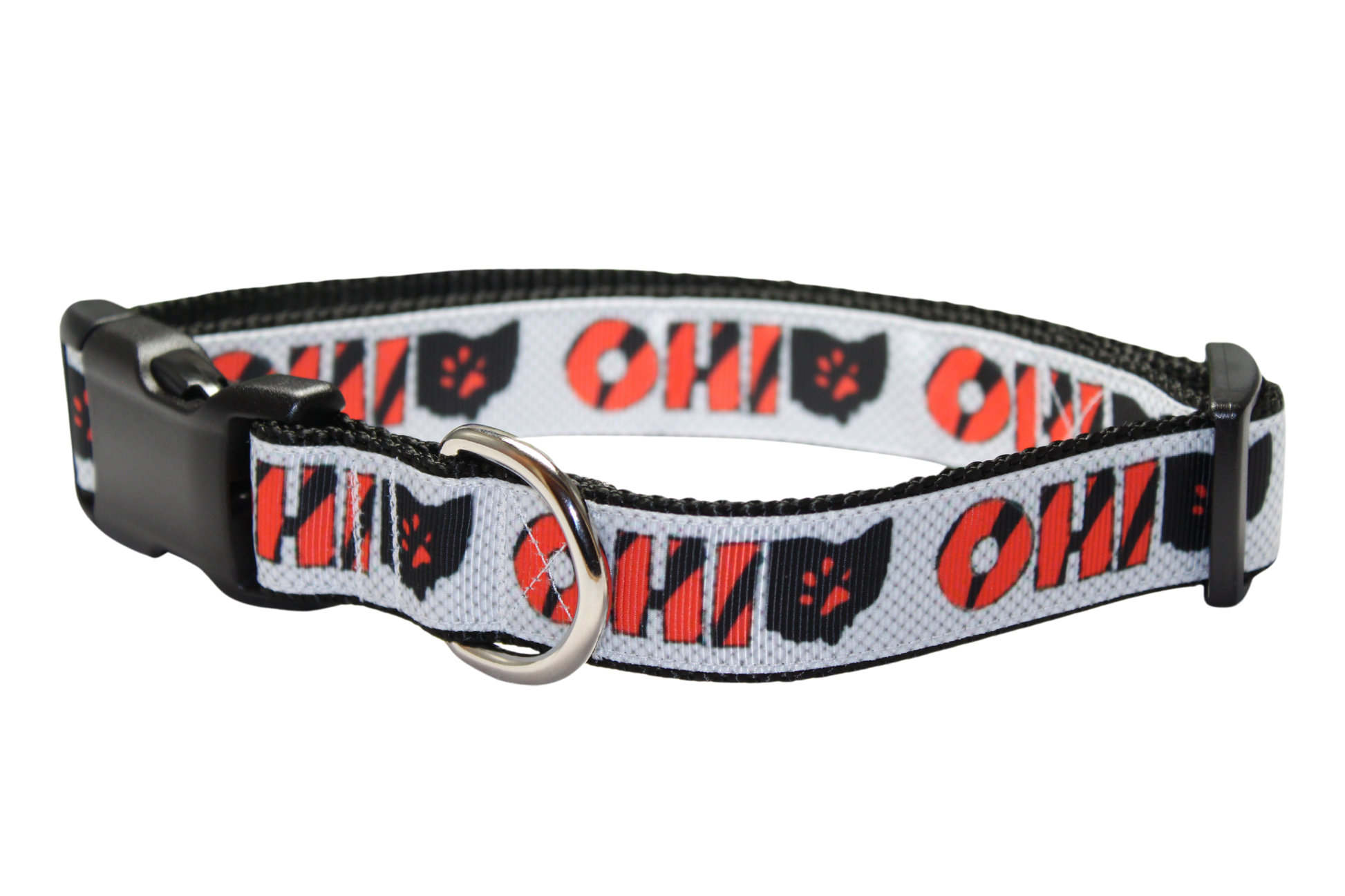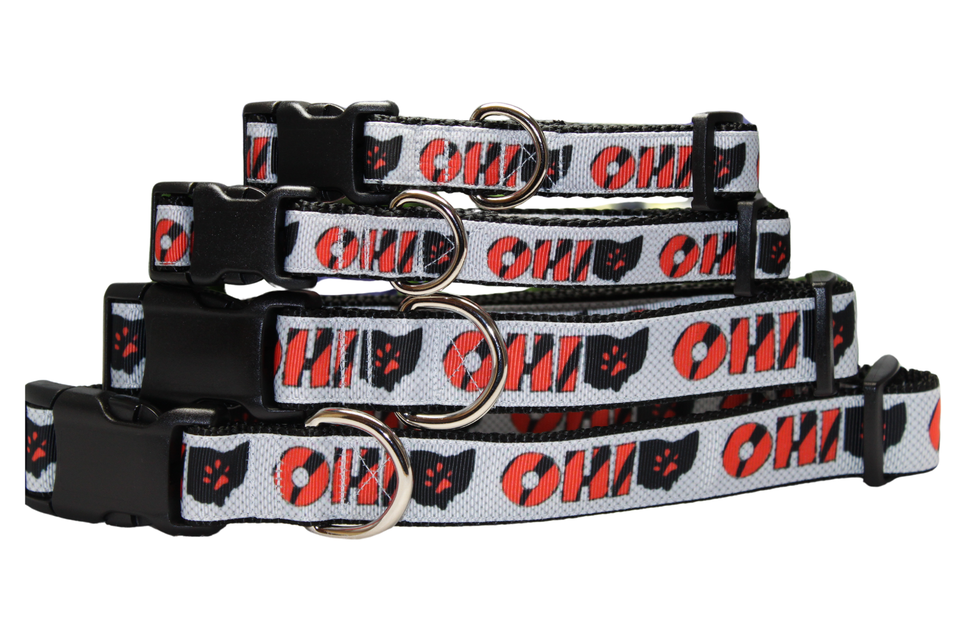 All collars are handmade made using 1-inch (x-large and large) 3/4 inch (medium and small) heavy nylon webbing grosgrain ribbon. The buckle is heavy grade plastic with side release. The x-large collar adjust to best fit dogs with necks ranging form 18-28 inches. The large collar adjusts to best fit dogs with necks ranging in size from 15 - 22 inches. The medium collar adjusts to best fit dogs with necks ranging in size from 12-18 inches. The small collar adjusts to best fit dogs with necks ranging in size from 9 to 14 inches.