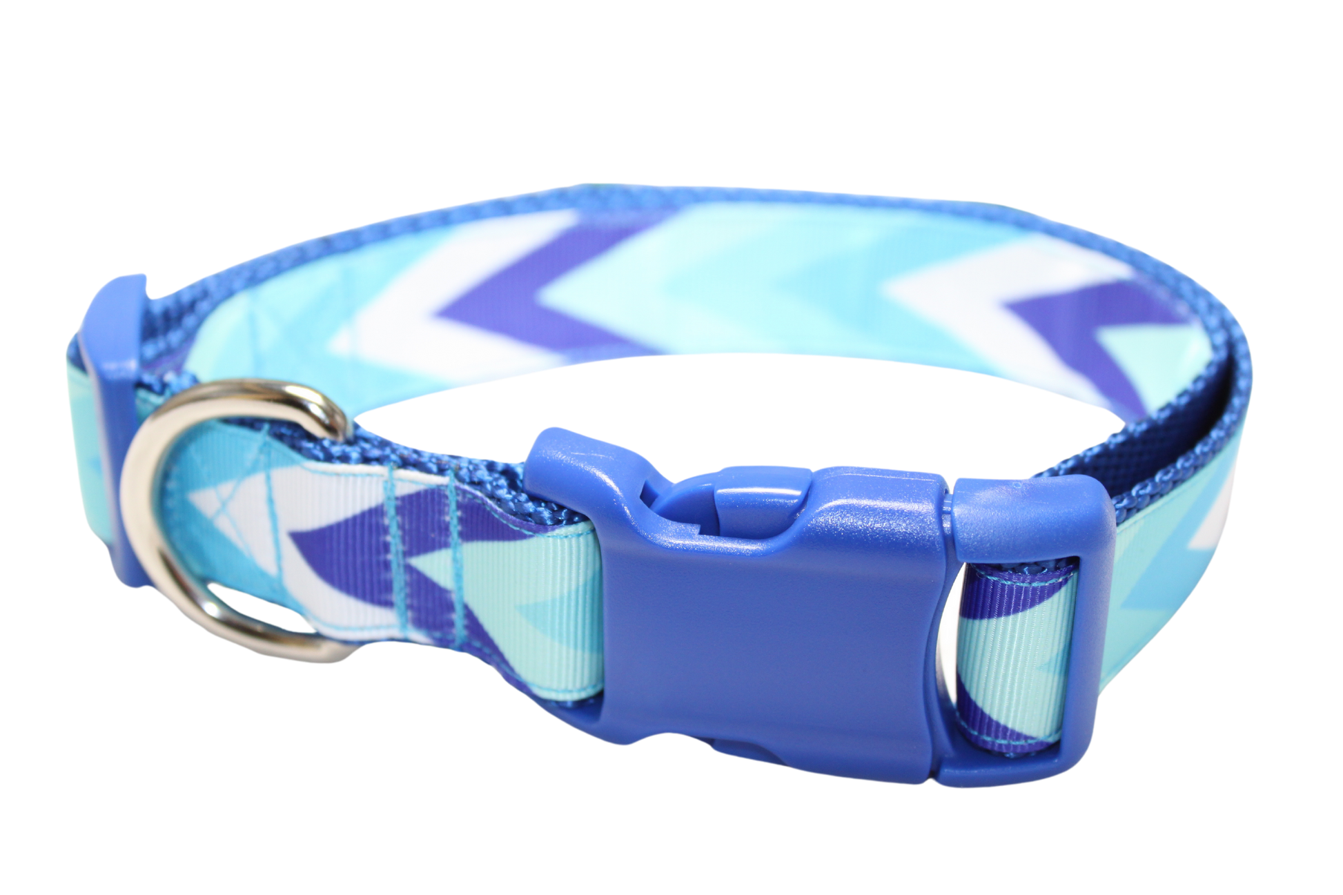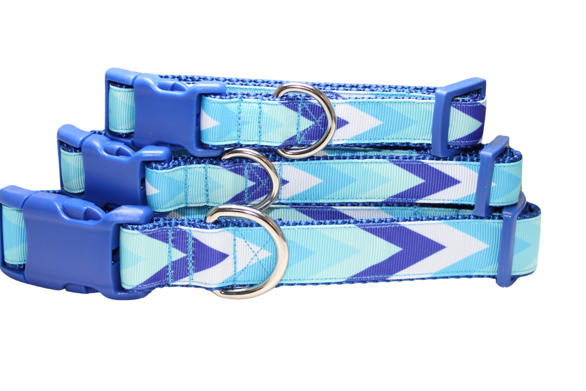 All collars are handmade made using 1-inch (x-large and large) 3/4 inch (medium and small) heavy nylon webbing grosgrain ribbon. The buckle is heavy grade plastic with side release. The x-large collar adjust to best fit dogs with necks ranging form 18-28 inches. The large collar adjusts to best fit dogs with necks ranging in size from 15 - 22 inches. The medium collar adjusts to best fit dogs with necks ranging in size from 12-18 inches. The small collar adjusts to best fit dogs with necks ranging in size from 9 to 14 inches.