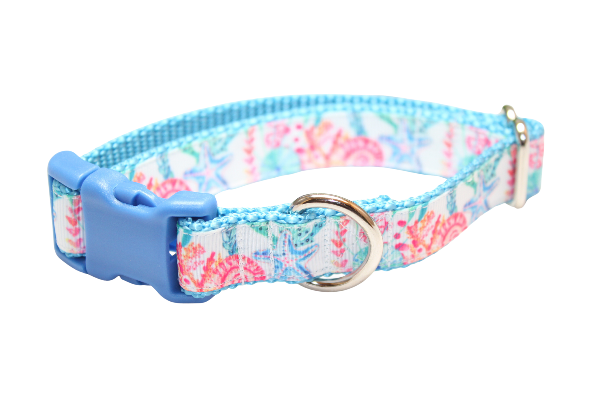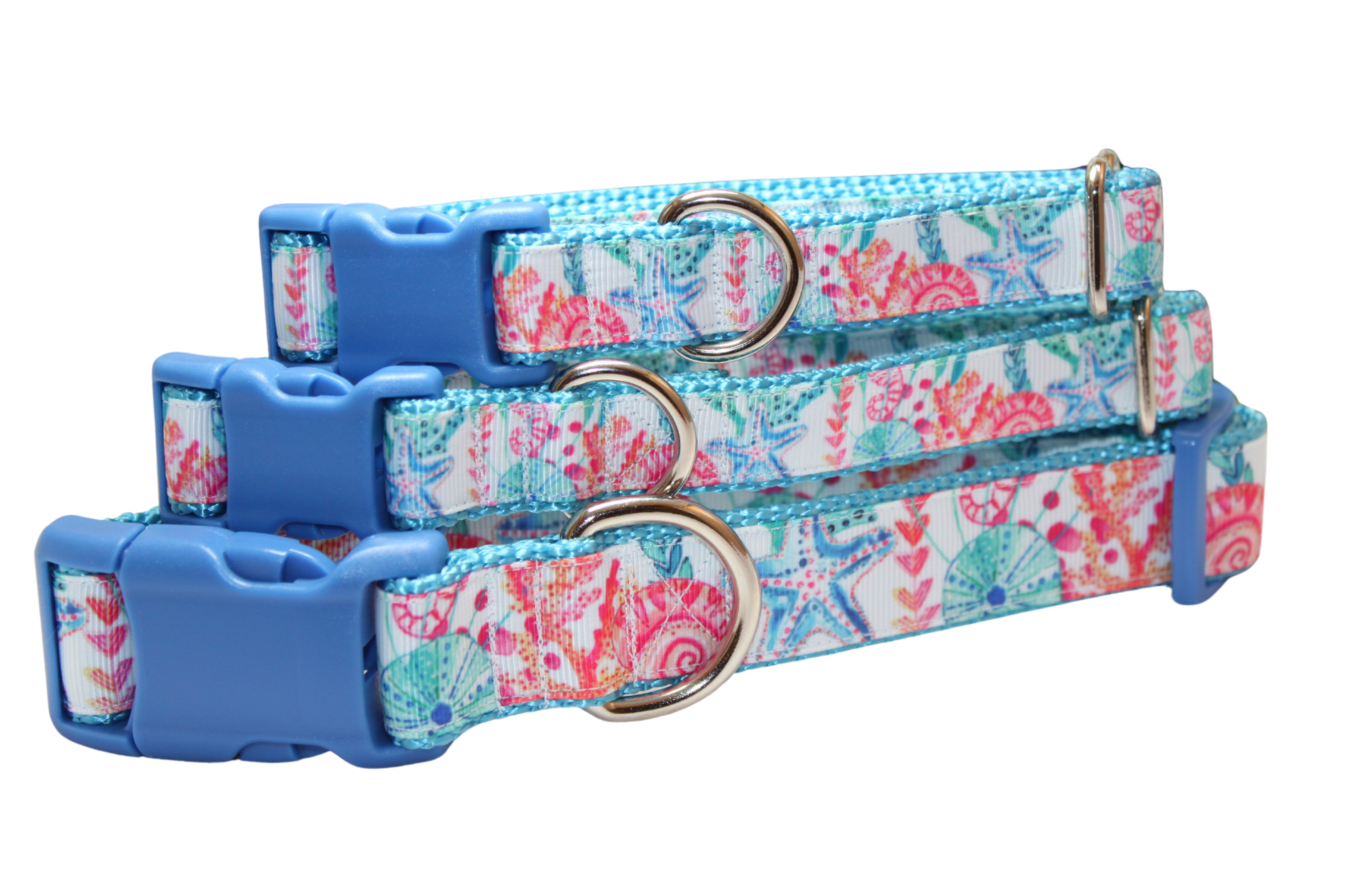 All collars are handmade made using 1-inch (x-large and large) 3/4 inch (medium and small) 5/8 inch (x-small) heavy nylon webbing grosgrain ribbon. The buckle is heavy grade plastic with side release. The x-large collar adjust to best fit dogs with necks ranging form 18-28 inches. The large collar adjusts to best fit dogs with necks ranging in size from 15 - 22 inches. The medium collar adjusts to best fit dogs with necks ranging in size from 12-18 inches. The small collar adjusts to best fit dogs with necks ranging in size from 9 to 14 inches. The x-small collar adjusts to best fit dogs with necks ranging in size from 8-12 inches.