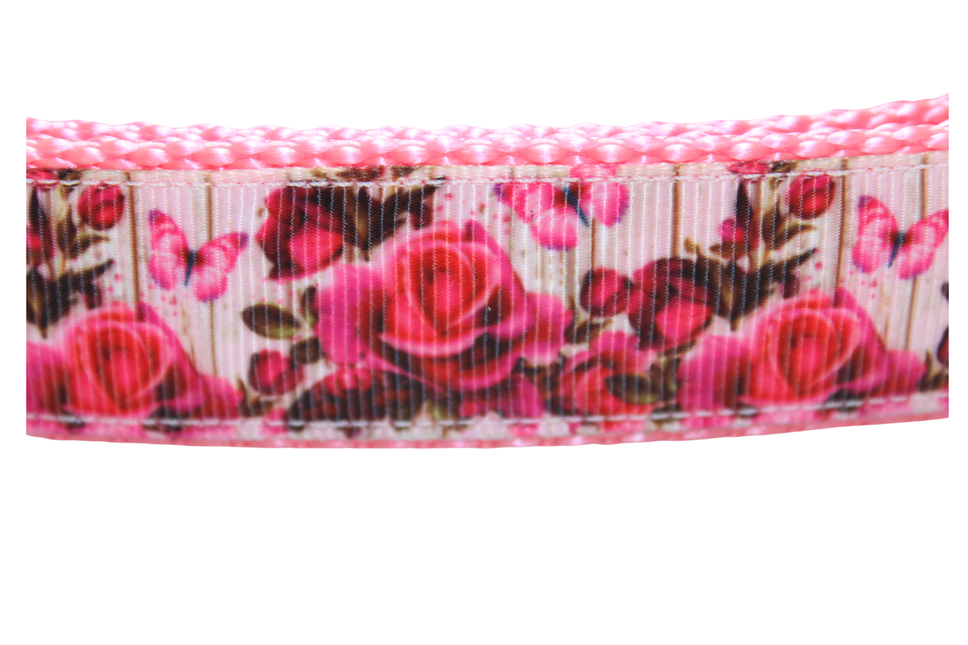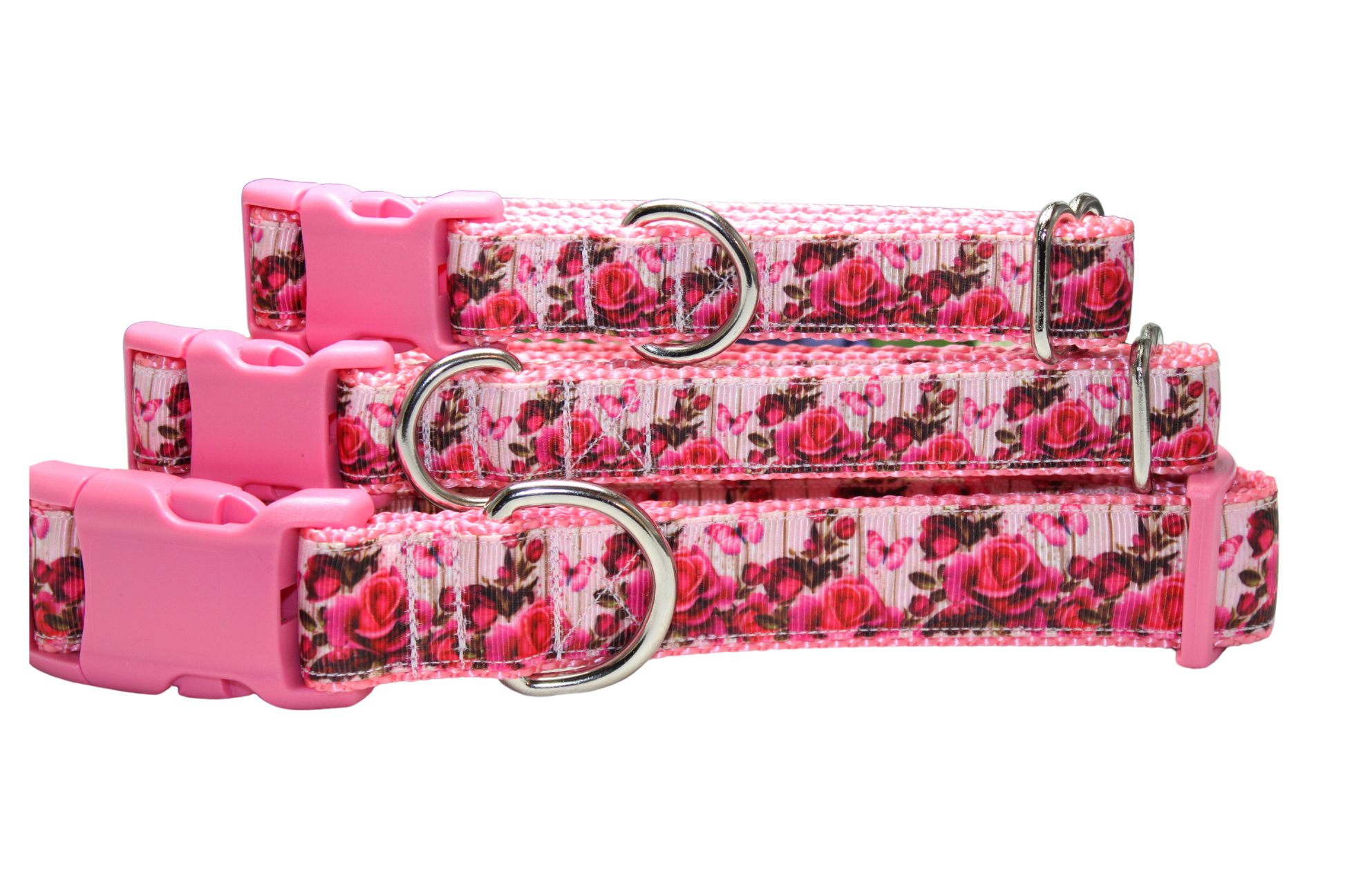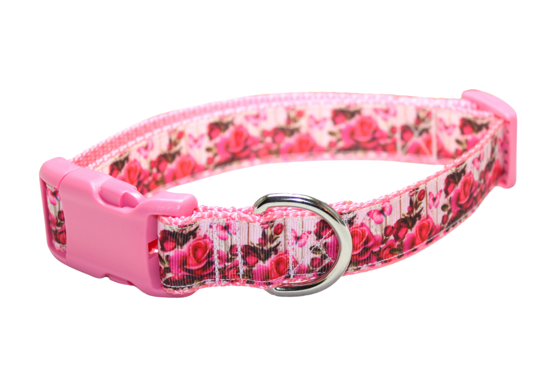 All collars are handmade made using 1-inch (x-large and large) 3/4 inch (medium and small) heavy nylon webbing grosgrain ribbon. The buckle is heavy grade plastic with side release. The x-large collar adjust to best fit dogs with necks ranging form 18-28 inches. The large collar adjusts to best fit dogs with necks ranging in size from 15 - 22 inches. The medium collar adjusts to best fit dogs with necks ranging in size from 12-18 inches. The small collar adjusts to best fit dogs with necks ranging in size from 9 to 14 inches.