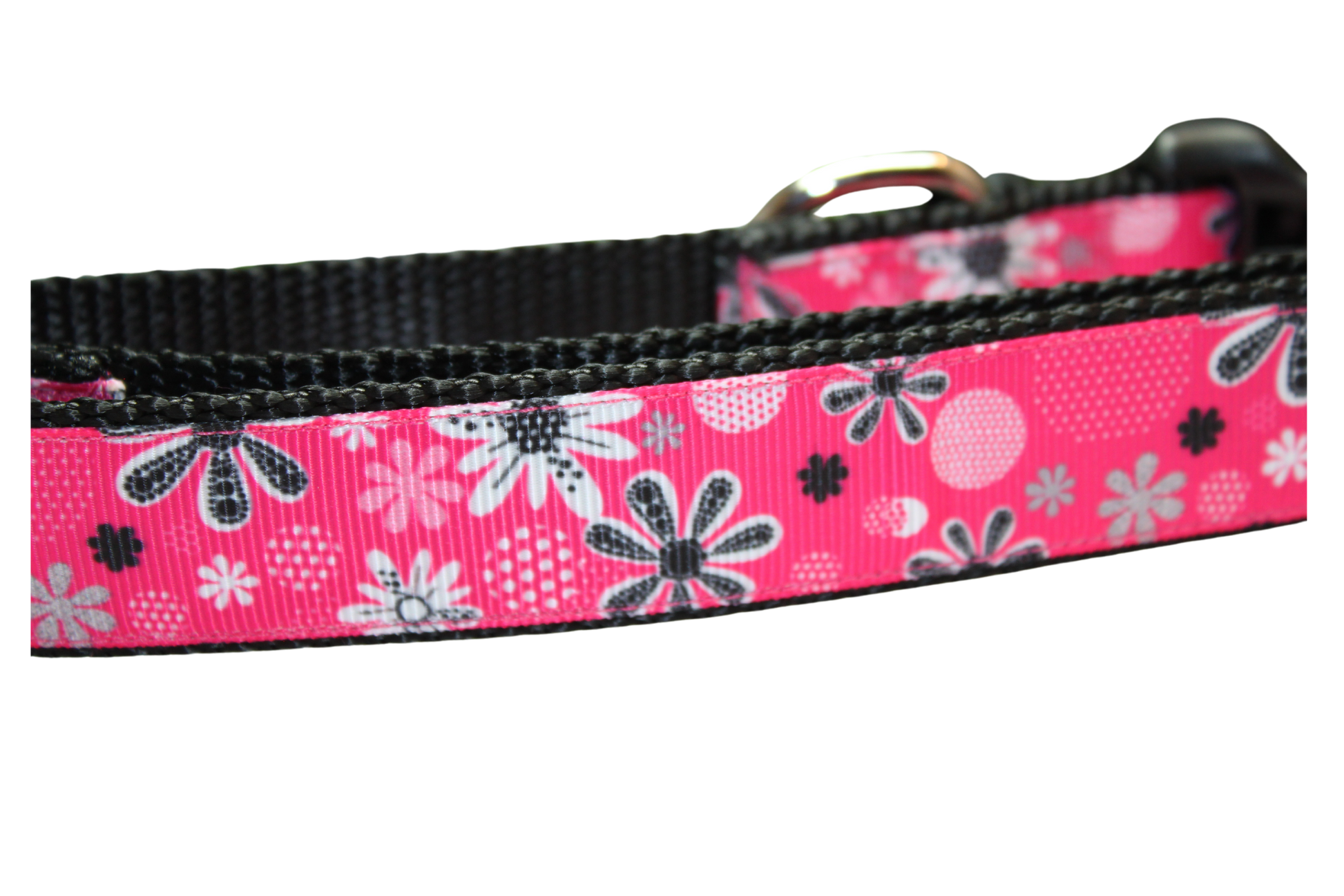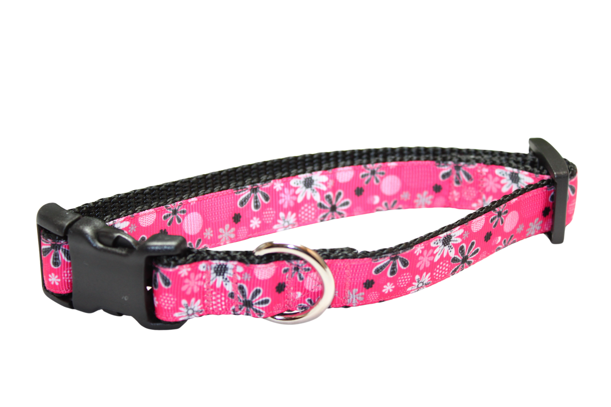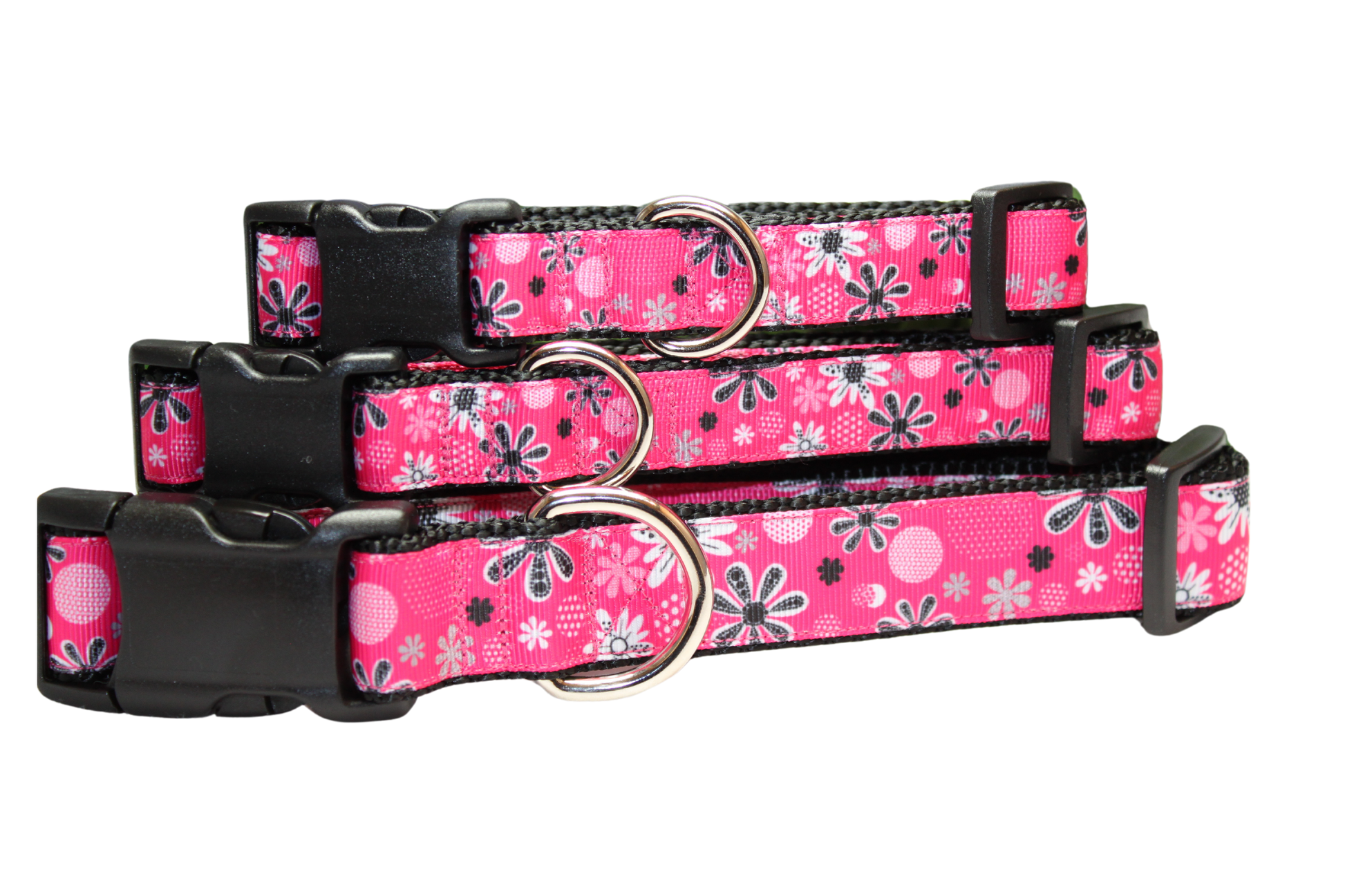 All collars are handmade made using 1-inch (x-large and large) 3/4 inch (medium and small) heavy nylon webbing grosgrain ribbon. The buckle is heavy grade plastic with side release. The x-large collar adjust to best fit dogs with necks ranging form 18-28 inches. The large collar adjusts to best fit dogs with necks ranging in size from 15 - 22 inches. The medium collar adjusts to best fit dogs with necks ranging in size from 12-18 inches. The small collar adjusts to best fit dogs with necks ranging in size from 9 to 14 inches.