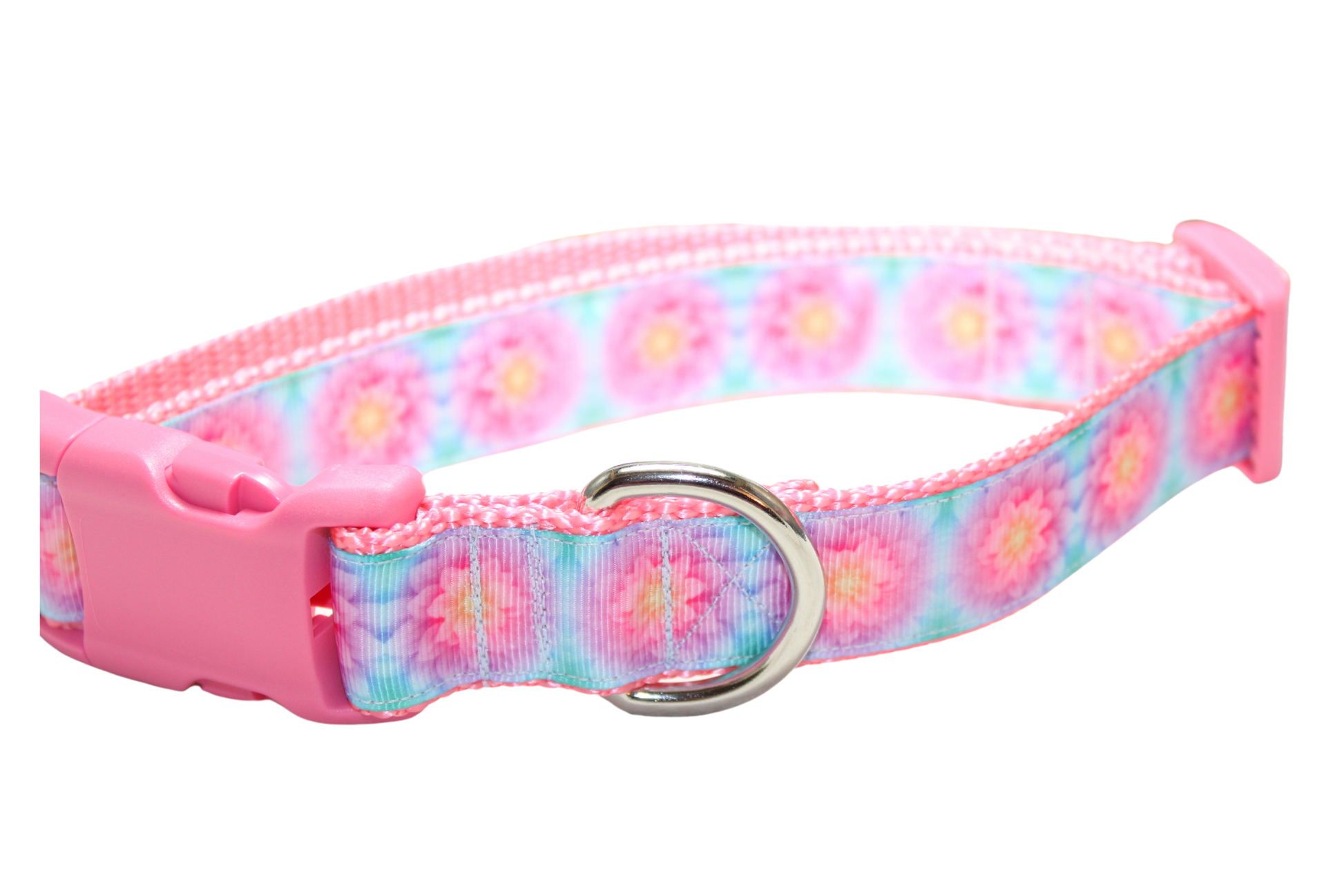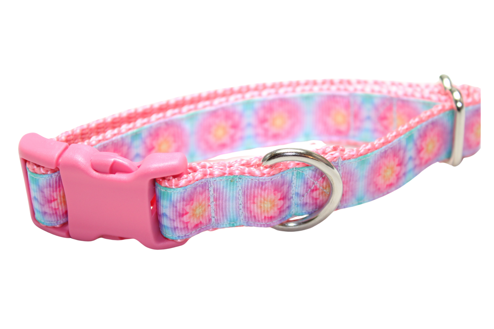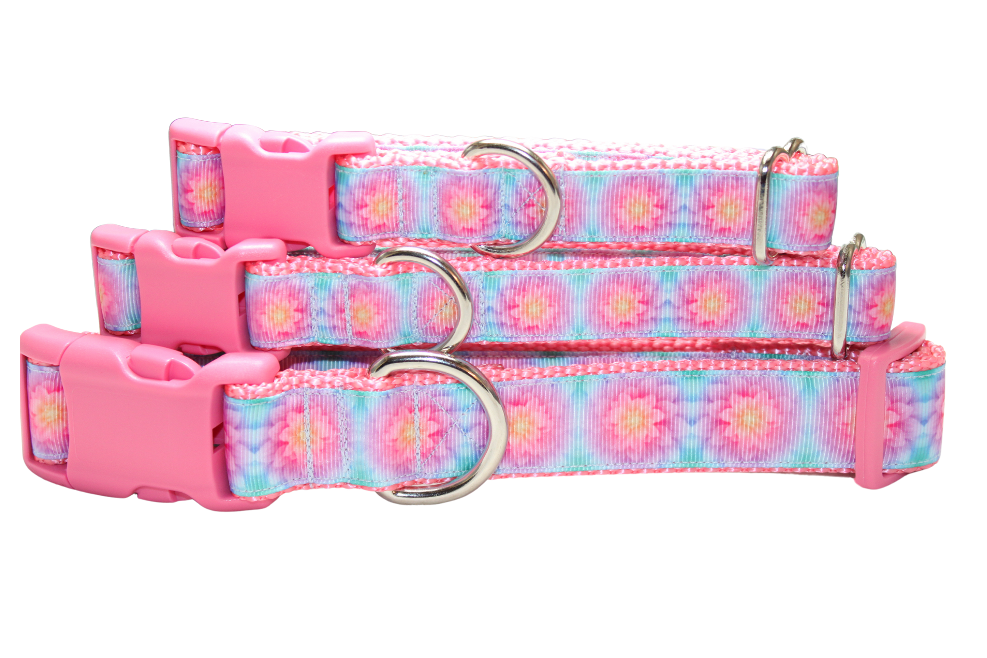 All collars are handmade made using 1-inch (x-large and large) 3/4 inch (medium and small) heavy nylon webbing grosgrain ribbon. The buckle is heavy grade plastic with side release. The x-large collar adjust to best fit dogs with necks ranging form 18-28 inches. The large collar adjusts to best fit dogs with necks ranging in size from 15 - 22 inches. The medium collar adjusts to best fit dogs with necks ranging in size from 12-18 inches. The small collar adjusts to best fit dogs with necks ranging in size from 9 to 14 inches.