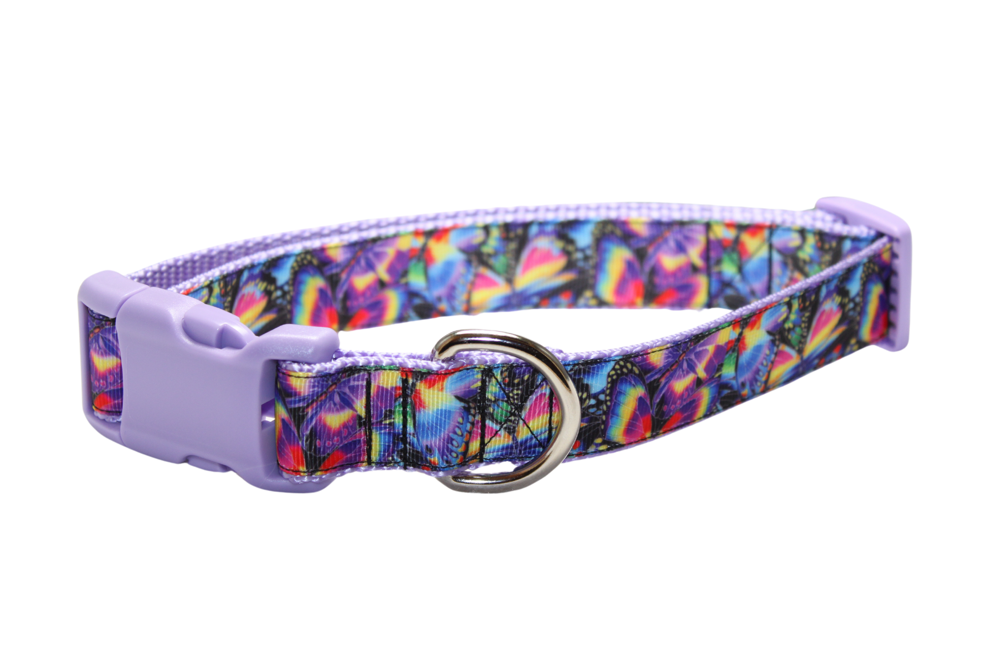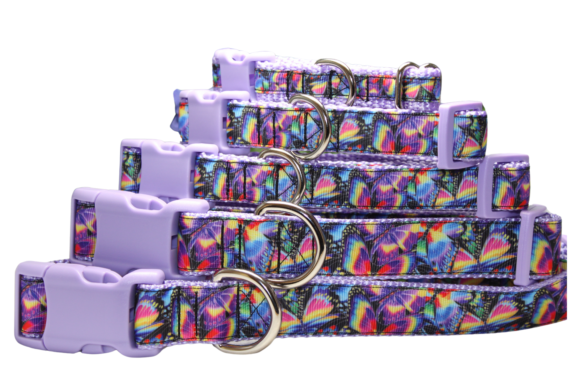 All collars are handmade made using 1-inch (x-large and large) 3/4 inch (medium and small) heavy nylon webbing grosgrain ribbon. The buckle is heavy grade plastic with side release. The x-large collar adjust to best fit dogs with necks ranging form 18-28 inches. The large collar adjusts to best fit dogs with necks ranging in size from 15 - 22 inches. The medium collar adjusts to best fit dogs with necks ranging in size from 12-18 inches. The small collar adjusts to best fit dogs with necks ranging in size from 9 to 14 inches.