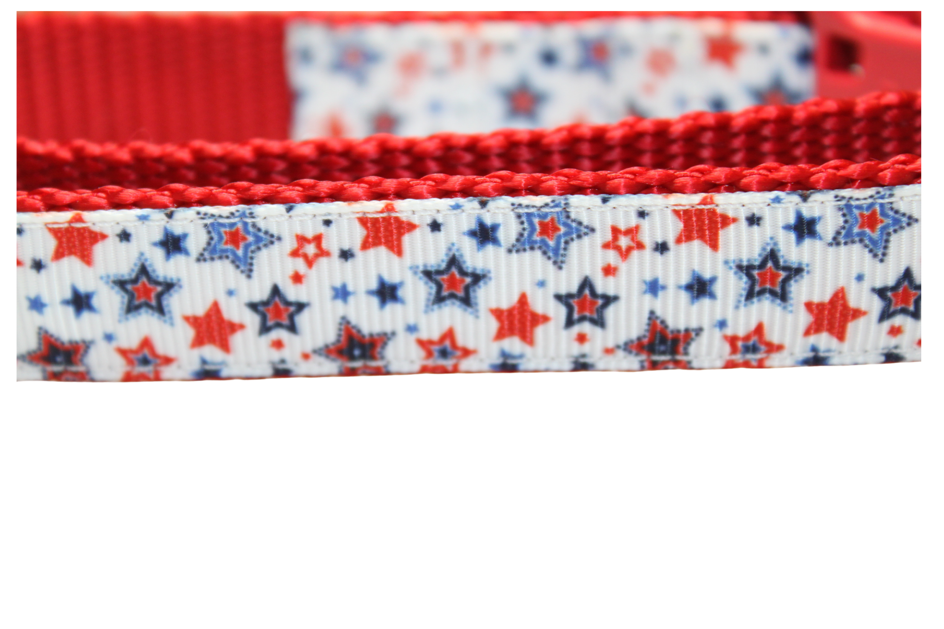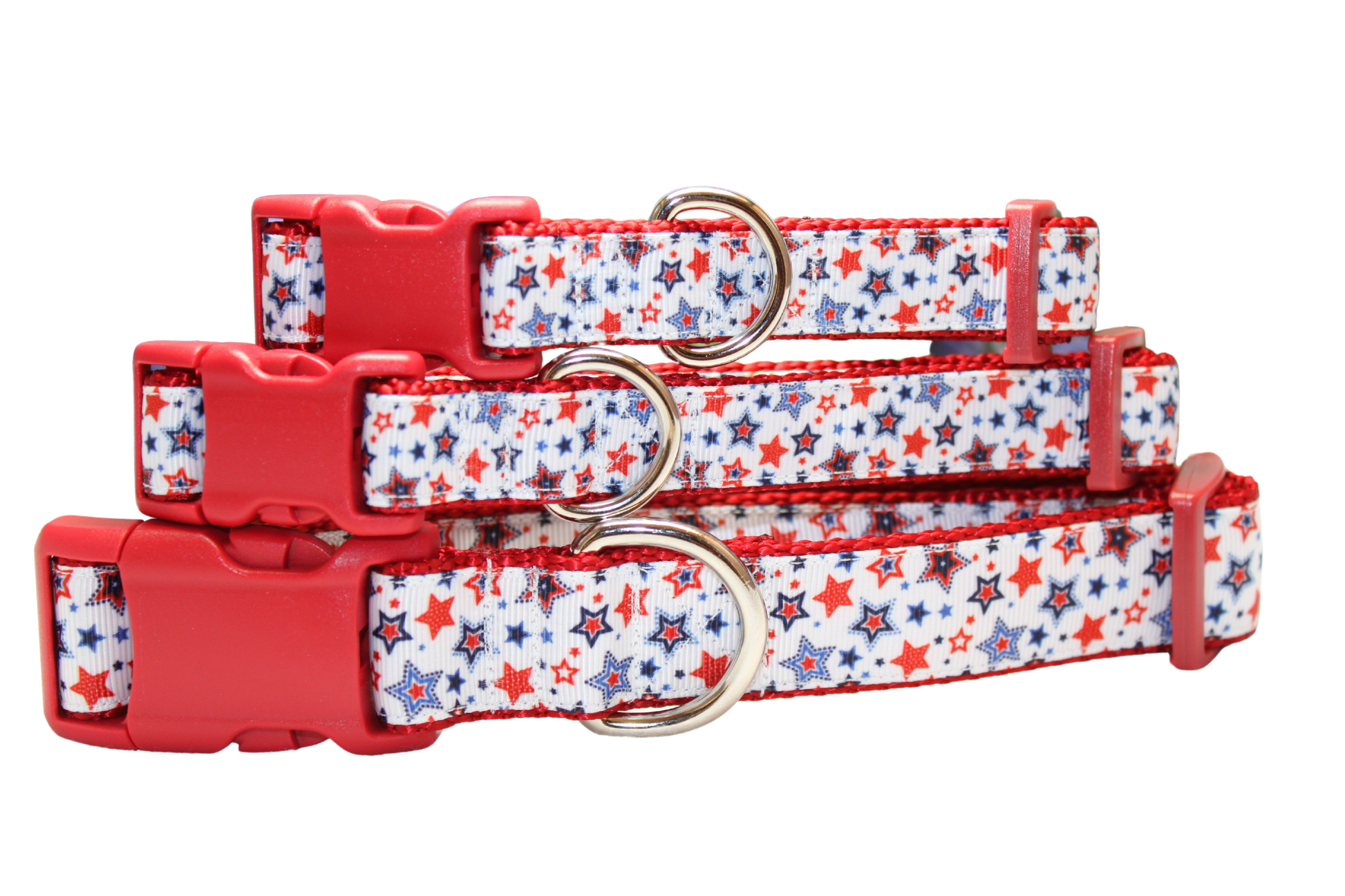 All collars are handmade made using 1-inch (x-large and large) 3/4 inch (medium and small) heavy nylon webbing grosgrain ribbon. The buckle is heavy grade plastic with side release. The large collar adjusts to best fit dogs with necks ranging in size from 15 - 22 inches. The medium collar adjusts to best fit dogs with necks ranging in size from 12-18 inches. The small collar adjusts to best fit dogs with necks ranging in size from 9 to 14 inches.