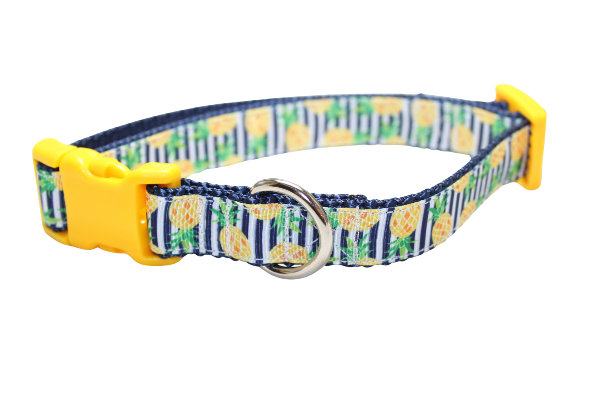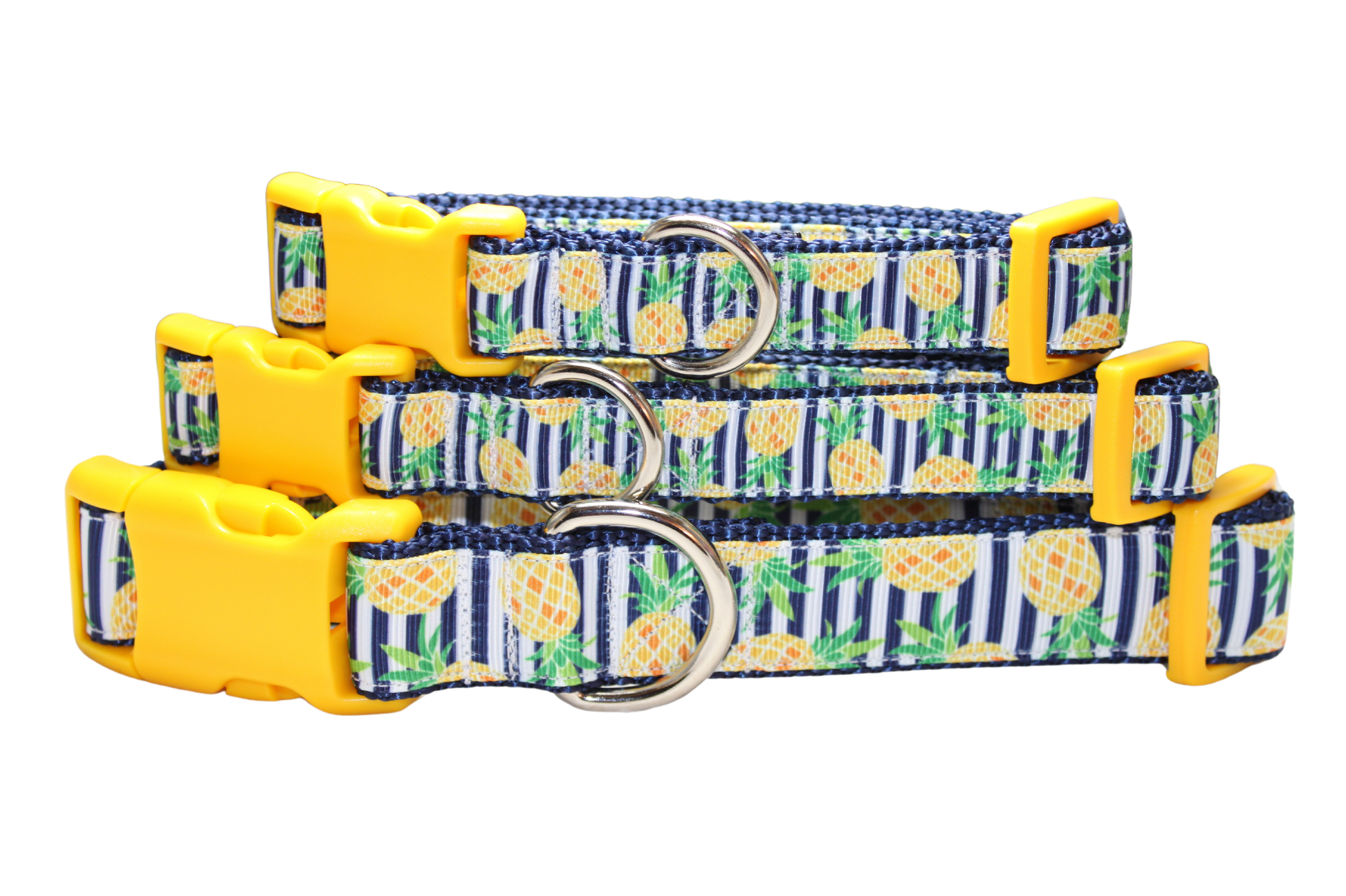 All collars are handmade made using 1-inch (x-large and large) 3/4 inch (medium and small) heavy nylon webbing grosgrain ribbon. The buckle is heavy grade plastic with side release. The x-large collar adjust to best fit dogs with necks ranging form 18-28 inches. The large collar adjusts to best fit dogs with necks ranging in size from 15 - 22 inches. The medium collar adjusts to best fit dogs with necks ranging in size from 12-18 inches. The small collar adjusts to best fit dogs with necks ranging in size from 9 to 14 inches.